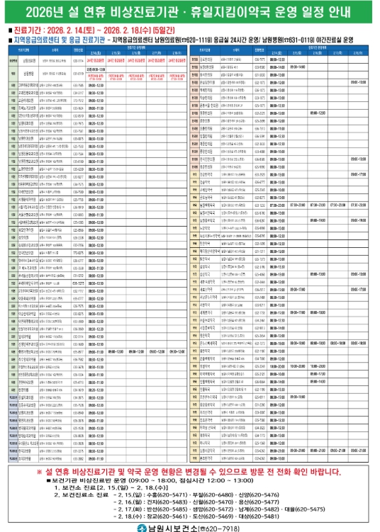 또한 남원시보건소 및 보건진료소는 설 연휴 기간 동안 보건의료대책반을 지속 운영해 경증 환자 진료와 응급상황 발생 시 신속한 대응체계를 유지한다.