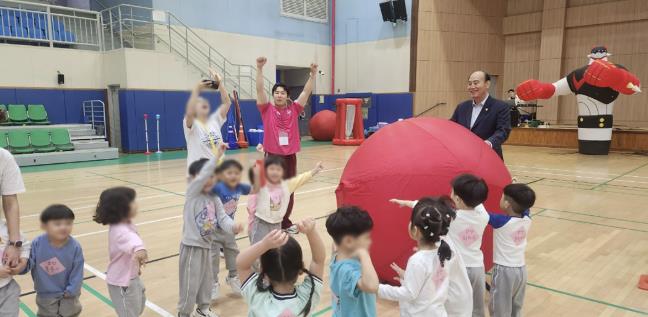 이번 행사는 원아와 보육교직원이 함께 참여해 경쾌한 음악에 맞춰 준비체조를 하고, 줄다리기·공던지기 등 단체게임을 즐기며 웃음과 활력이 넘치는 시간을 보냈다. 행사장에는 에어바운스, 레일기차, 바이킹 등 다양한 실외 놀이시설이 설치돼 연령별 어린이들이 안전하게 마음껏 뛰어놀 수 있도록 했다.