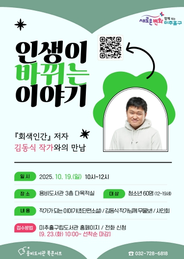 [파이낸셜경제=김기보 기자] 인천 미추홀구 용비도서관은 오는 10월 19일 청소년을 위한 특별한 북콘서트 ‘인생이 바뀌는 이야기’를 개최한다.