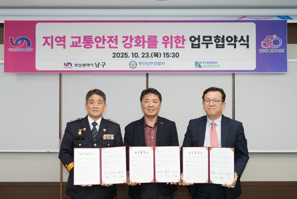 [파이낸셜경제=박영진 기자] 부산 남구는 지난 10월 23일, 부산 남부경찰서 및 도로교통공단 부산광역시지부와 함께‘지역 교통안전 강화를 위한 업무협약’을 체결했다고 밝혔다.