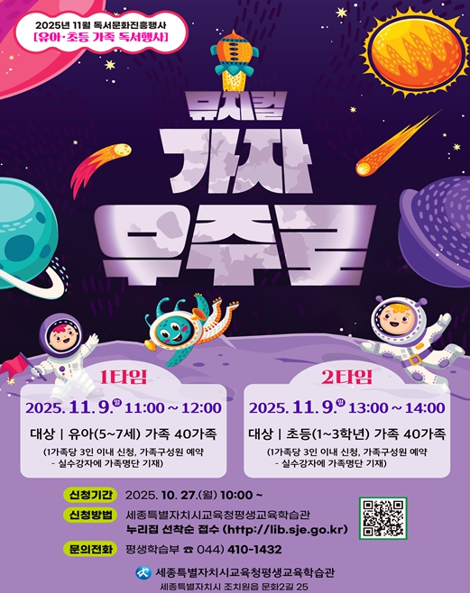 [파이낸셜경제=김영란 기자] 세종특별자치시교육청 평생교육학습관이 독서 문화 진흥에 대한 지역주민의 적극적인 관심과 참여를 유도하기 위해 11월 공연과 특강을 운영한다.