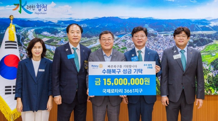 [파이낸셜경제=김예빈 기자] 9월 22일 국제로타리 3661지구(총재 황인재)가 합천군청 군수실을 방문해 집중호우 피해 이재민들을 돕기 위한 성금 1,500만원을 기탁했다.