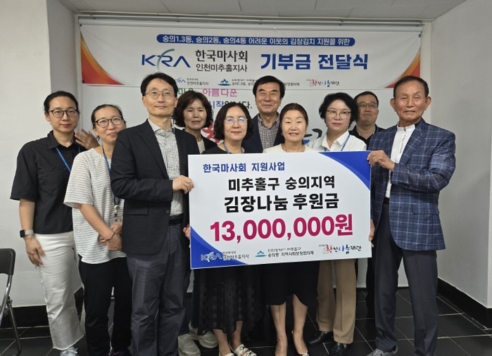 [파이낸셜경제=김기보 기자] 한국마사회 인천미추홀지사(지사장 조영진)는 미추홀구 숭의1·3동, 숭의2동, 숭의4동 일대 취약계층을 지원하기 위해 김장 나눔 후원금 1,300만 원을 학산나눔재단에 전달했다고 23일 밝혔다.