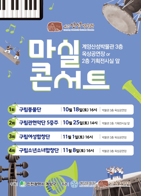 오는 11월 1일에는 구립여성합창단, 11월 8일에는 구립소년소녀합창단이 참여한 합창 공연이 박물관 옥상 야외무대에서 펼쳐져, 단풍이 물든 계양산을 배경으로 한 감성 무대가 관람객들에게 잊지 못할 가을의 추억을 선사할 예정이다.