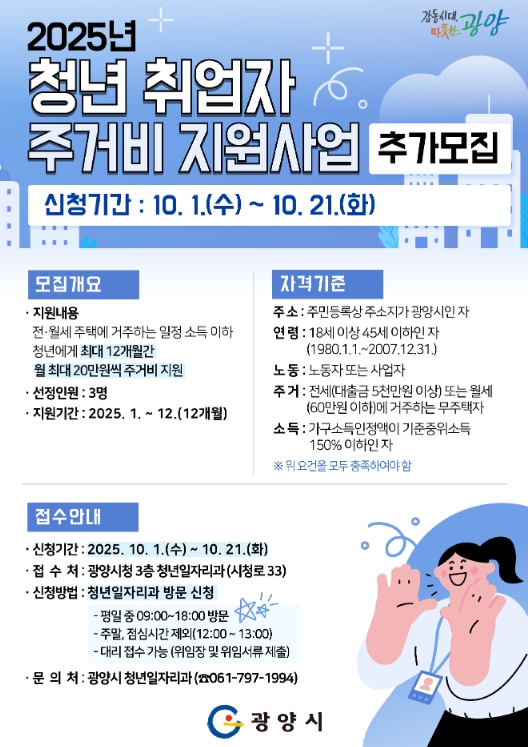 [파이낸셜경제=김예빈 기자] 광양시는 청년들의 주거 안정을 위해 10월 1일부터 21일까지 ‘2025년 청년 취업자 주거비 지원사업’ 추가 모집을 진행한다고 밝혔다.