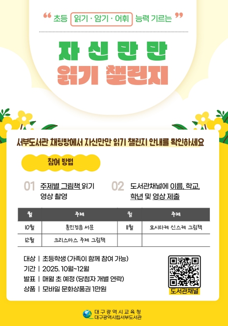 [파이낸셜경제=김지훈 기자] 대구서부도서관은 10월부터 12월까지 초등학생을 대상으로 책 읽기의 즐거움을 느끼고 독서에 대한 자신감을 키울 수 있도록 ‘자신만만 읽기 챌린지’를 운영한다.