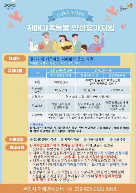 ‘치매가족돌봄 안심휴가지원’은 경기도 전역에서 시행 중인 치매가족 지원정책의 일환으로, 부천시치매안심센터가 주관해 운영하고 있다. 가족이 일정 기간 집을 비우거나 휴식을 취해야 할 경우 치매환자에게 안정적인 돌봄서비스를 제공할 수 있도록 돕는 데 목적이 있다.