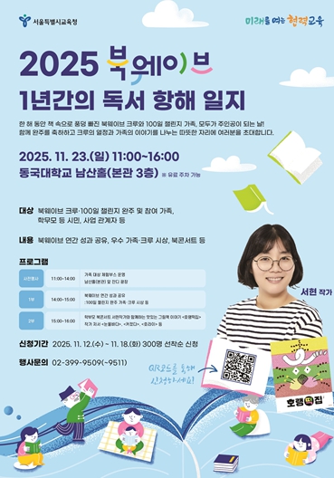 [파이낸셜경제=김예빈 기자] 서울특별시교육청은 오는 11월 23일(일) 동국대학교 남산홀에서 가족독서 캠페인 '온 가족 북웨이브'의 1년 여정을 돌아보는'2025 북웨이브, 1년간의 독서 항해일지'를 개최한다. 이번 행사는 북웨이브 100일 챌린지 완주 가족, 북웨이브크루, 학생·시민이 함께 참여하는 서울시교육청 대표 독서문화 축제다.