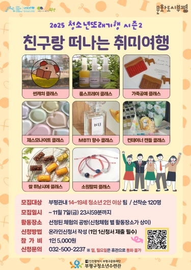 [파이낸셜경제=김기보 기자] 부평구 청소년수련관은 오는 7일까지 ‘2025 청소년 또래기행 시즌2-친구랑 떠나는 취미여행’에 참여할 청소년을 모집한다.