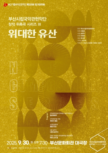 [파이낸셜경제=박영진 기자] 부산시립국악관현악단이 오는 9월 30일 오후 7시 30분, 부산문화회관 대극장에서 제231회 정기연주회를 개최한다. 이번 무대는 창작위촉곡 시리즈 Ⅲ '위대한 유산'이라는 부제로, 우리 민족이 지켜온 정신적·예술적 전통을 현대적 언어로 재해석한 작품들을 선보인다.