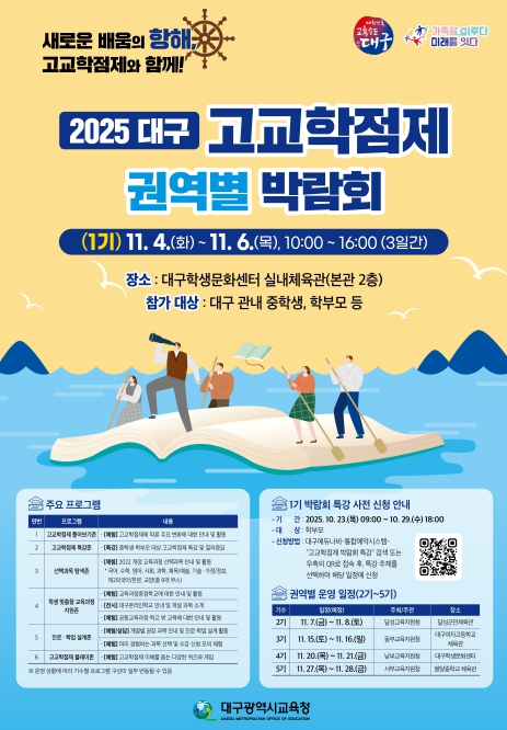 [파이낸셜경제=김지훈 기자] 대구시교육청은 올해 전면 도입된 고교학점제에 대한 중학생과 학부모의 이해를 돕기 위해 ‘대구 고교학점제 권역별 박람회’를 총 5기에 걸쳐 개최한다.