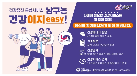 [파이낸셜경제=박영진 기자] 부산 남구는 다양한 건강 증진 서비스를 구민들에게 통합 제공하는 건강 증진 통합서비스 『남구는 건강이지(easy)!』를 운영한다.