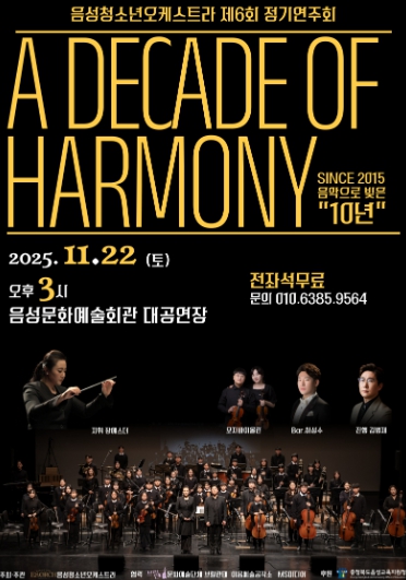 [파이낸셜경제=김기보 기자] 충청북도음성교육지원청의 방과후학교 민간공모사업 운영 단체인 음성청소년오케스트라(지휘 장에스더)가 창단 10주년을 맞이하여 오는 11월 22일 오후 3시, 음성문화예술회관 대공연장에서 제6회 정기연주회 ‘A DECADE OF HARMONY’를 개최한다.