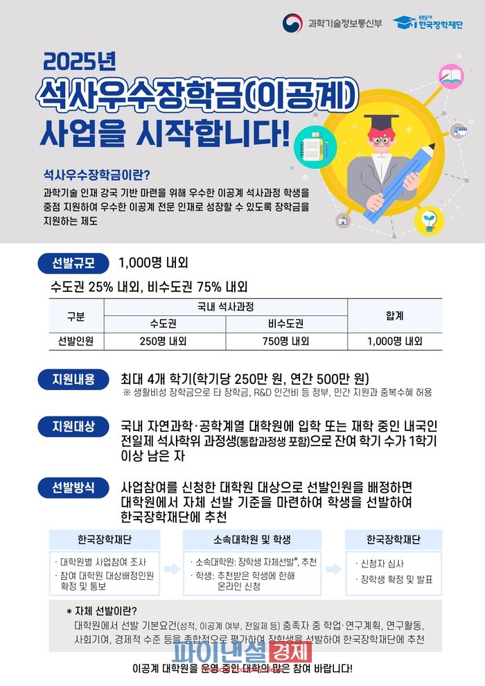 [파이낸셜경제=박영진 기자] 과학기술정보통신부(장관 배경훈, 이하 ‘과기정통부’)와 한국장학재단(이사장 배병일)은 2025년도 이공계 석사우수장학금 장학사업을 올해 처음으로 시행한다고 밝혔다. 이공계 석사우수장학금은 사업 참여 신청을 한 대학원의 소속 학생 중 장학생을 선발하며, 대학원 사업 참여 신청 기간은 9월 19일(금)부터 10월 2일(목)까지이다.