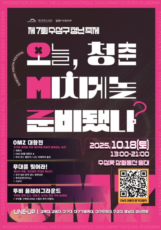 [파이낸셜경제=김지훈 기자] 대구 수성구는 오는 18일 수성못 상화동산 일대에서 ‘2025 제7회 수성구 청년축제’를 개최한다.