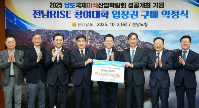 [파이낸셜경제=김예빈 기자] 전라남도는 2일 도청 접견실에서 전남RISE 참여대학 총장단과 함께 ‘2025 남도국제미식산업박람회 입장권 구매 약정식’을 개최했다.
