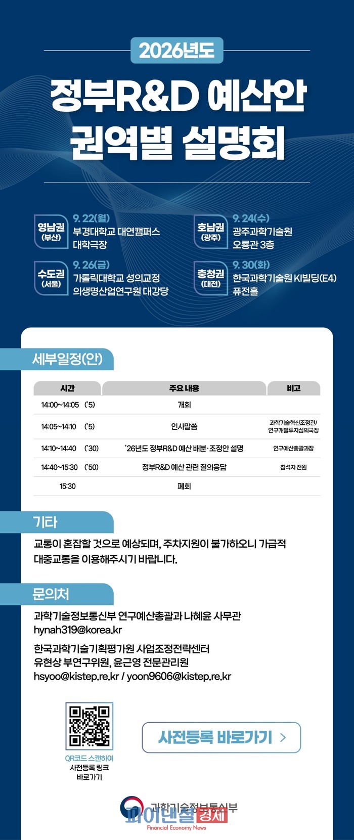 [파이낸셜경제=박영진 기자] 과학기술정보통신부(장관 배경훈, 이하 ‘과기정통부’) 과학기술혁신본부는 9월 22일(월)부터 수도권, 충청권, 호남권, 영남권 등 4개 권역에서 2026년도 국가연구개발사업 예산안 권역별 설명회를 개최한다고 밝혔다.