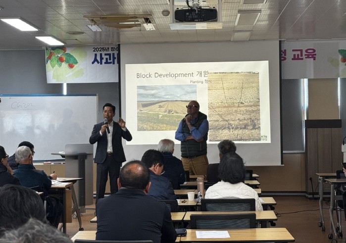 이번 교육은 지역 사과 재배 농가 50명을 대상으로 뉴질랜드 사과 재배 전문가 마크 에릭슨(Waima Orchard 대표) 박사를 초청해 진행됐으며, 해외 선진기술을 접목해 장수사과의 생산성 향상과 재배 체계 고도화를 도모하기 위해 마련됐다.