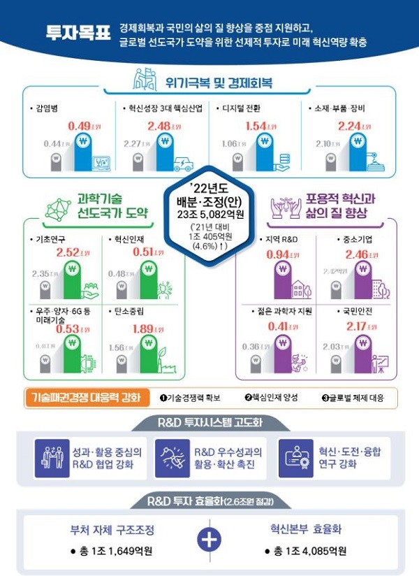정부는 경제 회복, 선도국가 도약, 포용적 혁신을 위한 주요 국정과제 완수와 글로벌 기술패권 경쟁에 대응한 전략기술 역량 강화에 역점을 두고 투자하기로 했다.