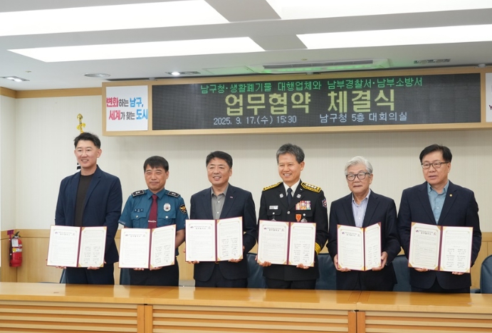 [파이낸셜경제=박영진 기자] 부산 남구는 지난 17일 구청 대회의실에서 남부경찰서, 남부소방서, 생활폐기물 대행업체와 업무협약(MOU)을 체결하고, 주민의 생활 현장에서 위험 요소를 조기 발견·대응하는 생활 속 안전망 구축 사업을 본격 추진한다고 밝혔다.