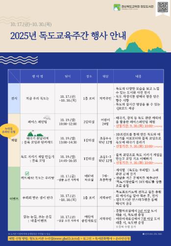 [파이낸셜경제=김지훈 기자] 경상북도교육청 청도도서관은 오는 10월 17일부터 30일까지 지역 주민을 대상으로 '2025년 독도교육주간 행사'를 운영한다.