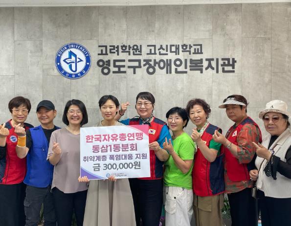 [파이낸셜경제=박영진 기자] 영도구 한국자유총연맹 동삼1동위원회는 지난 7월 11일 폭염으로 어려움을 겪고 있는 취약계층을 돕기 위해 지원금 30만원을 영도구장애인복지관에 전달했다.