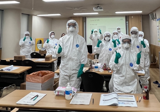 교육 주요 내용은 조류인플루엔자 인체감염증 발생 대비·대응체계, 농장 등에서 조류인플루엔자 발생 시 인체감염 예방조치 요령 등 이론 교육과 개인보호복(Level D) 착·탈의 등 실제 현장 투입을 대비한 실습 위주의 감염병 예방 훈련으로 구성됐다.