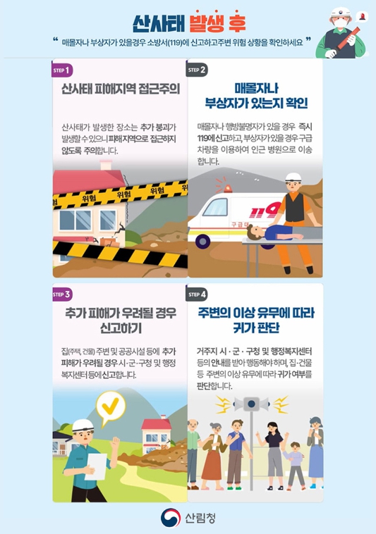- 산사태가 발생한 장소는 추가 붕괴가 발생할 수 있으니 피해 지역으로 접근하지 않도록 주의합니다.