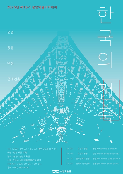 첫 회차인 10월 22일 ‘조선의 궁궐’을 시작으로 10월 29일 ‘조선의 왕릉’, 11월 5일 ‘불교 건축과 단청’, 11월 12일 ‘한국(인천)의 근대건축’ 순으로 진행한다.