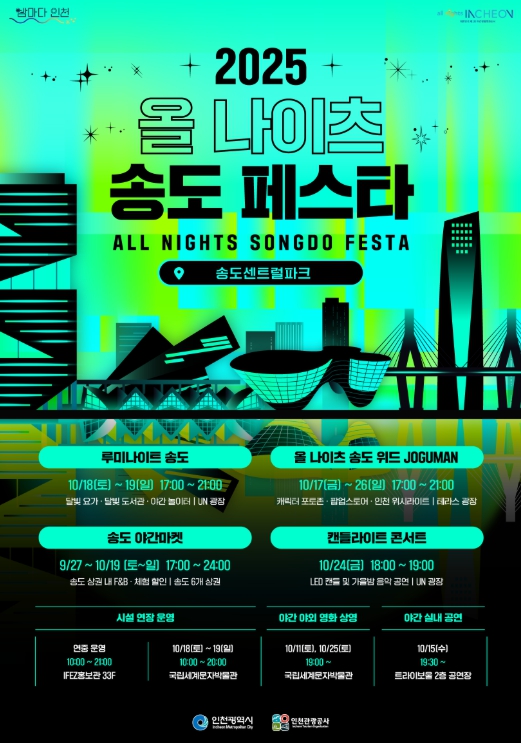 [파이낸셜경제=김기보 기자] 인천광역시와 인천관광공사는 오는 10월 17일부터 26일까지 송도센트럴파크 일대에서 '2025 올 나이츠 송도 페스타'를 개최한다고 밝혔다.