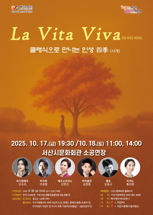 이완섭 서산시장은 “이번 ‘라 비타 비바(La Vita Viva)’ 공연은 계절의 아름다움과 인생의 깊이를 동시에 느낄 수 있는 무대로, 시민들에게 특별한 감동을 선사할 것”이라며 “앞으로도 일상 속에서 수준 높은 문화예술을 향유할 수 있도록 다채로운 기획공연을 이어가겠다”고 말했다.