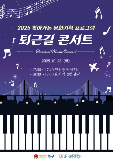 [파이낸셜경제=김기보 기자] (재)인천중구문화재단(이사장 김정헌)은 오는 28일 저녁 퇴근길 시민들을 위한 특별한 문화 행사 ‘2025 영종 퇴근길 콘서트’를 개최한다.
