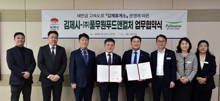 [파이낸셜경제=김예빈 기자] 김제시는 27일 ㈜풀무원푸드앤컬처와 '새만금전주간' 고속도로 개통에 따라 새롭게 조성되는‘김제휴게소’운영에 따른 업무협약을 체결했다고 밝혔다.