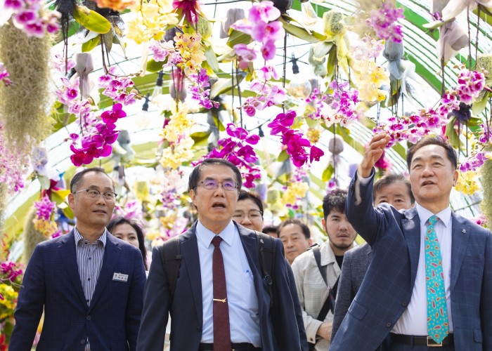 | ▲ 오른쪽부터 농업생태원을 둘러보는 정장선 평택시장, 황웨이저 대만 타이난시장, 이우진 평택시 농업기술센터 소장 |