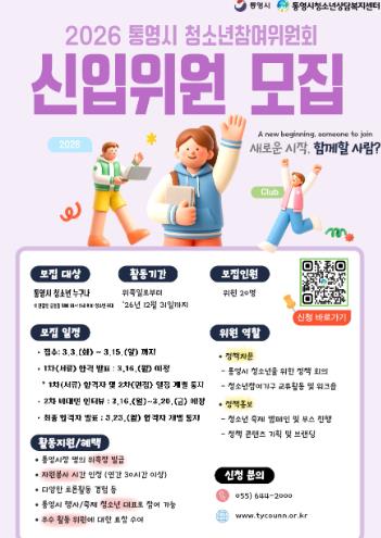 [파이낸셜경제=김예빈 기자] 통영시는 관내 청소년을 대상으로 오는 15일까지 ‘2026년 통영시 청소년참여위원회’위원을 모집한다.