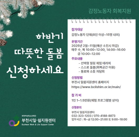 [파이낸셜경제=김기보 기자] 부천여성청소년재단이 운영하는 부천시 일쉼지원센터에서 25년 하반기 감정노동자 치유회복을 위한 코스형 회복 프로그램(‘따뜻한 돌봄’) 참가단체를 모집한다.