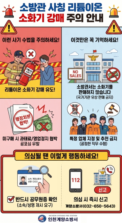 [파이낸셜경제=김기보 기자] 계양소방서는 최근 소방공무원을 사칭해 리튬배터리용 소화기 등 물품 구매를 요구하는 사기 행위가 발생하고 있다며 시민들의 각별한 주의를 당부했다.