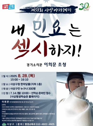 [파이낸셜경제=박영진 기자] 부산 사상구는 오는 8월 28일 오후 3시, 사상구청 한마당홀에서 소리꾼 이희문을 초청해 제71회 사상아카데미를 개최한다.
