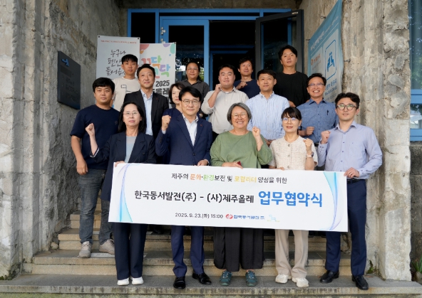 [파이낸셜경제=김영란 기자] 한국동서발전㈜(사장 권명호) 제주사업추진단과 (사)제주올레(대표이사 안은주)는 23일 15시 서귀포 제주올레여행자센터에서 ‘제주의 문화·자연환경 보전 및 지역인재 양성을 위한 업무협약’을 체결했다.
