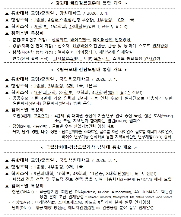 이번 개정은 2026년 3월, 강원대와 국립강릉원주대, 국립목포대와 전남도립대, 국립창원대와 경남도립거창・남해대 등 통합대학의 원활한 출범을 지원하기 위해 진행됐다. 개정을 통해 통합대학 출범 관련 명칭・직제 등을 변경하고, 폐지되는 대학의 학생 및 교직원에 대한 경과조치를 마련했다. 통합대학별 주요 내용은 다음과 같다.