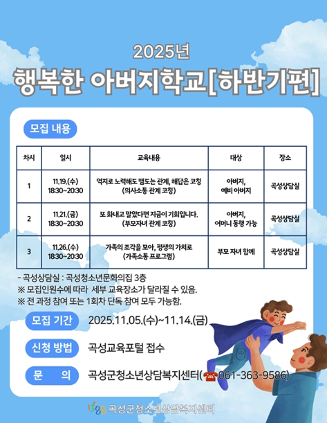 센터 관계자는 "이번 아버지학교는 지역 청년회 수요조사 결과를 반영해 핵심 주제를 선정했으며 원하는 차시를 선택하여 들을 수 있도록 유연성을 충분히 살린 것이 가장 큰 특징이다"라며, "자녀와의 관계 개선뿐만 아니라 자기 효능감을 증진하고 가족 내 소통 역량을 회복하여 청소년의 건강한 성장을 지원하는 이번 기회에 많은 관심과 참여를 기대한다"라고 밝혔다.