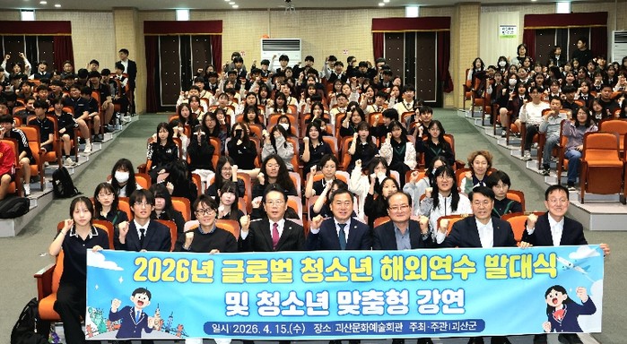[파이낸셜경제=김기보 기자] 충북 괴산군은 15일 괴산문화예술회관에서 괴산고등학교 및 관내 중학교 학생들을 대상으로 ‘글로벌 청소년 해외연수 발대식’을 개최했다고 밝혔다.
