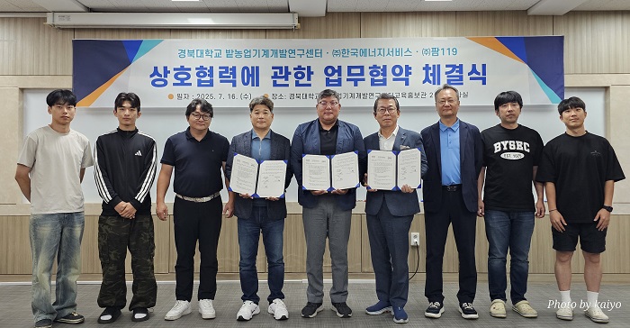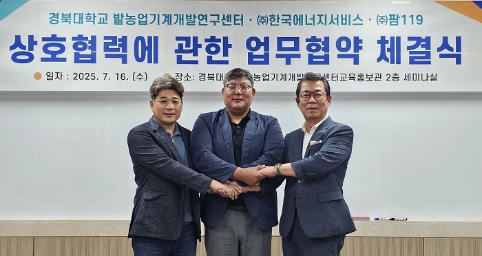 [파이낸셜경제=김예빈 기자] 경북대학교 밭농업기계개발연구센터에서 7월 16일(화) 오전 11시, 농업 분야의 지속가능성과 혁신을 이끌기 위한 산학연 업무협약(MOU) 체결식이 열렸다. 이날 협약은 경북대학교, ㈜한국에너지서비스, ㈜119팜 등 3개 기관이 참여한 가운데 진행됐으며, 각 기관은 영농형 태양광 시스템과 친환경 방제 기술, 농업 에너지 효율화 기술의 공동 개발 및 실증을 통해 탄소 중립형 농생명 시스템 구축에 협력하기로 합의했다.