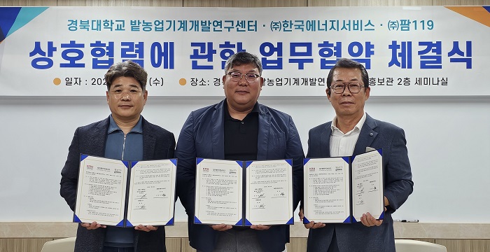 | ▲ 경북대학교·㈜한국에너지서비스·㈜119팜 ,농업기술 및 에너지 융합 통한 지속가능 농업 MOU 체결 |