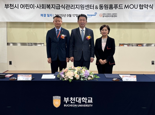 | ▲ (왼쪽부터)이종성 부천대학교 대외부총장, 유영주 동원홈푸드 급식식재사업부장, 이수정 부천시어린이·사회복지급식관리지원센터장이 17일 부천대학교에서 업무 협약을 맺고 기념 촬영을 하고 있다. [사진=부천시어린이·사회복지급식관리지원센터 제공] |