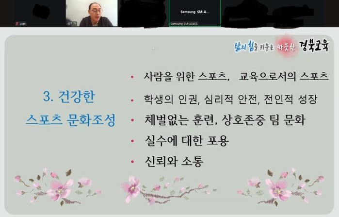 [파이낸셜경제=김영란 기자] 경북교육청은 25일 본청 4층 스마트오피스에서 도내 학교운동부지도자 300여 명을 대상으로 학생 선수 인권 보호와 (성)폭력 예방을 위해 화상(ZOOM) 교육을 실시했다고 밝혔다.