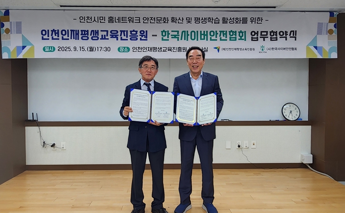 [파이낸셜경제=김기보 기자] 인천시민의 안전문화 확산과 평생학습 활성화를 위해 인천인재평생교육진흥원과 한국사이버안전협회가 2025년 9월 15일 업무협약을 체결했다.
