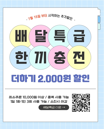 프로모션 기간은 7월 15일부터 7월 31일까지 진행되며, ▲ 더하기 2,000원 할인 쿠폰이 제공된다. 특히 7월에 제공되는 ▲‘배달비 지원’최대 3,000원 할인 쿠폰, ▲ 7월 셋째 주 금요일(7.18.) ‘부천시 특급의 날’ 5,000원 할인 쿠폰 등 다른 쿠폰과 중복사용이 가능하여 혜택이 더욱 크다.
