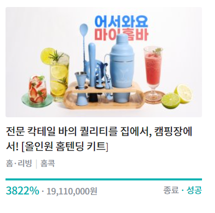 특히 창업동아리[홈콕]는 대부분 칵테일 쉐이커는 은색 스테인리스로 디자인이 다양하지 못하다고 생각하여 주방에 두고 사용할 때 하나의 인테리어 소품이 되길 바라는 마음으로 시제품을 제작하여 성결대학교 창업보육센터에 입주 후, 사업자등록을 하고 와디즈에서 3822%의 높은 펀딩에 성공했다.