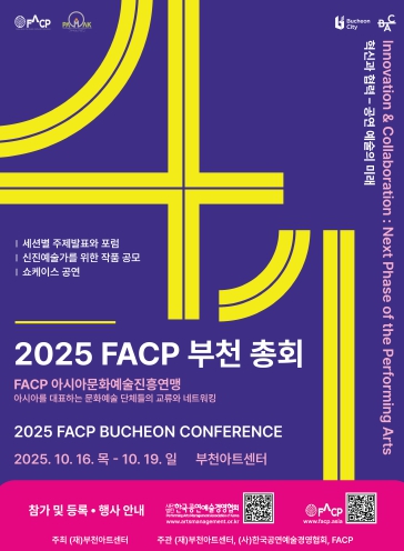 [파이낸셜경제=김기보 기자] (재)부천아트센터(대표이사 직무대행 유성준)가 주최하고, (재)부천아트센터, 아시아문화진흥연맹(FACP), (사)한국공연예술경영협회가 공동 주관하는 ‘제41회 2025 FACP 부천 총회(Federation for Asian Cultural Promotion, 이하 FACP)'가 오는 10월 16일부터 19일까지 4일간 부천아트센터 일대에서 개최된다.